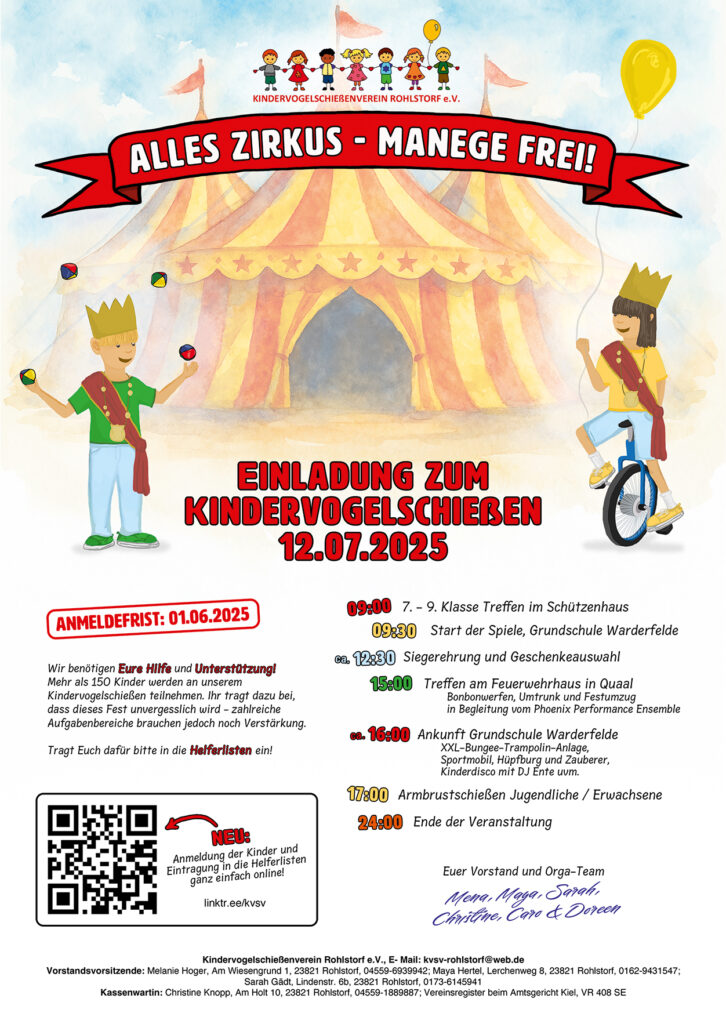 Am Samstag, den 12. Juli 2025 verwandelte sich unser Sportplatz an der Grundschule Warderfelde in eine bunte Zirkusarena, als das alljährliche Kindervogelschießen unter dem Motto „Alles Zirkus – Manege frei“ stattfand. Bei schönsten norddeutschen Wetter haben sich 148 Kinder zu den traditionellen Spielen angemeldet. Diese und alle anderen großen und kleinen Gäste konnten einen unvergesslichen Tag voller Spaß, Spannung und Zirkusatmosphäre erleben. Es fehlte nichts, was man im Zirkus nicht auch bekommt – von leckerem Popcorn, süßer Zuckerwatte bis hin zu alkoholfreien Cocktails von „The ERK“. Ein herzliches Dankeschön geht an alle Helferinnen und Helfer, die mit viel Engagement und Freude zum Gelingen dieses besonderen Tages beigetragen haben. Ein besonderer Dank gilt auch der Freiwilligen Feuerwehr Rohlstorf, die mit ihrer Unterstützung bei unserem Umzug durchs Dorf die Sicherheit gewährleistete. DJ Dirk von „Die Partymacher“ brachte ganz viel Stimmung mit guter Musik, Tanz und